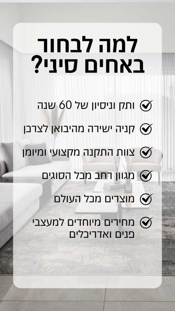 כבר 60 שנה שאנחנו, אחים סיני, מלווים אתכם ביצירת מרחבי מגורים ועסקים מעוצבים ומרשימים. כחנות משפחתית עם שני סניפים, אנו מציעים ONE STOP SHOP לכל פתרונות העיצוב – שטיחים, וילונות, פרקטים, טפטים, חיפויי קיר וקרניזים – והכול במחירים משתלמים הודות להיקפי הרכישה הגדולים שלנו.